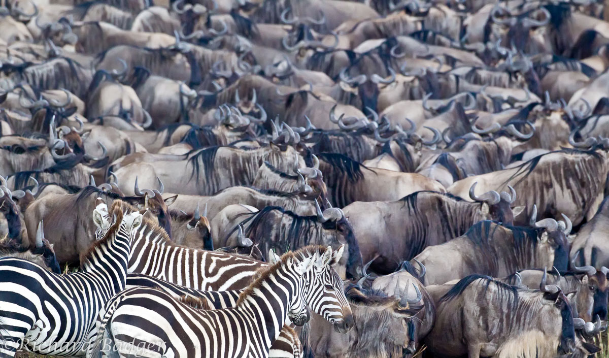 Wildebeest and Zebra gather at the edge of the Mara River during the "Great Migration", Kenya.